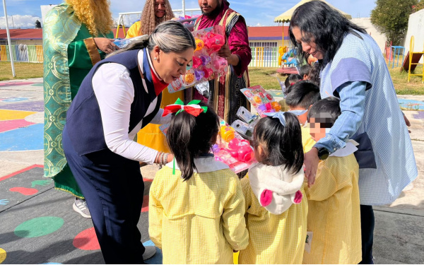 Kritsbey Pérez Flores entrega juguetes en preescolares Luis Munive y Rosaura Zapata de Tetlanohcan