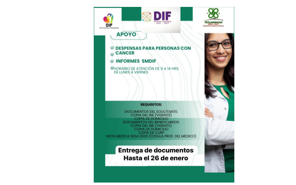 El Sistema Municipal DIF informa que la fecha límite para la entrega de documentos es el lunes 26 de enero, por lo que se invita a las personas interesadas a acudir con sus requisitos completos.