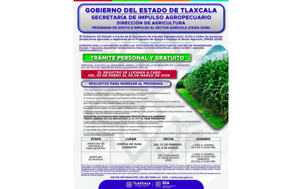385 Grados / Contla de Juan Cuamatzi / REDACCION / El Gobierno de Contla de Juan Cuamatzi informó que se encuentra abierta la ventanilla de registro para el Programa de Apoyo e Impulso al Sector Agrícola (PAISA) 2026.