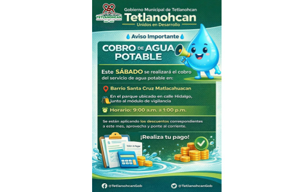 385Grados / Tetlanohcan / REDACCIÓN / El Gobierno Municipal de Tetlanohcan informa a la población del barrio Santa Cruz Matlacahuacan que este sábado se realizará el cobro del servicio de agua potable, con el objetivo de facilitar el cumplimiento de esta obligación y acercar los servicios municipales a las y los usuarios.