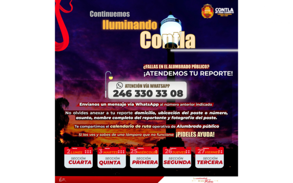 385 Grados / Contla de Juan Cuamatzi / REDACCIÓN / En el municipio de Contla de Juan Cuamatzi, autoridades municipales hicieron un llamado a la ciudadanía para reportar luminarias fundidas o que requieran reparación, con el objetivo de fortalecer el servicio de alumbrado público en la demarcación.