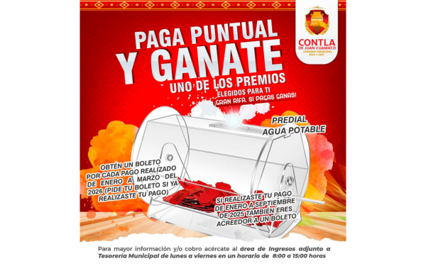 385 Grados / Contla de Juan Cuamatzi / REDACCIÓN / El Gobierno Municipal de Contla de Juan Cuamatzi anunció la puesta en marcha de la campaña “Si pagas, ganas”, mediante la cual se realizará una rifa dirigida a contribuyentes que cumplan puntualmente con el pago del impuesto predial y el servicio de agua potable.