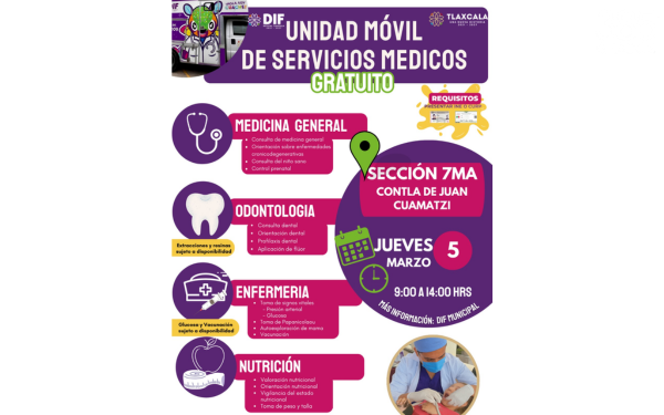 El Sistema Municipal DIF, en coordinación con el SEDIF Tlaxcala, informó que la jornada se llevará a cabo el próximo jueves 5 de marzo en la presidencia de comunidad de la Sección Séptima, en un horario de 9:00 a 14:00 horas.