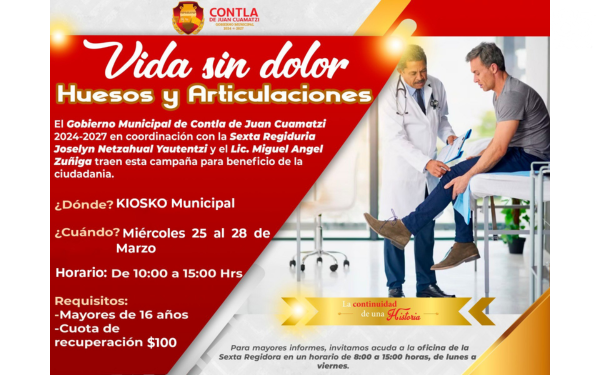 385 Grados / Contla de Juan Cuamatzi / REDACCIÓN / El gobierno municipal de Contla de Juan Cuamatzi, a través de la Regiduría de Salud, invitó a la población a participar en la campaña “Vida sin dolor: Huesos y articulaciones”, una jornada enfocada en la prevención y detección oportuna de enfermedades relacionadas con el sistema óseo.