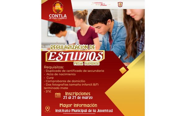 De acuerdo con la información difundida por las autoridades, las inscripciones se realizarán del 23 al 27 de marzo en las instalaciones del Instituto Municipal de la Juventud, ubicadas dentro del Sistema Municipal DIF de Contla, en calle Unión S/N, Sección Segunda.