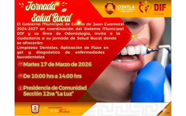 385 Grados / Contla de Juan Cuamatzi / REDACCIÓN / Con el objetivo de detectar y atender oportunamente enfermedades bucodentales en la población, el Gobierno Municipal de Contla de Juan Cuamatzi, a través del área de Odontología del Sistema Municipal DIF, llevará a cabo una jornada de salud bucal dirigida a habitantes del municipio.
