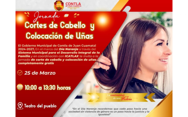 385 Grados / Contla de Juan Cuamatzi / REDACCIÓN / El Gobierno Municipal de Contla de Juan Cuamatzi, a través del Sistema Municipal DIF y en coordinación con el ICATLAX, llevará a cabo una jornada de servicios de belleza dirigida a la población.