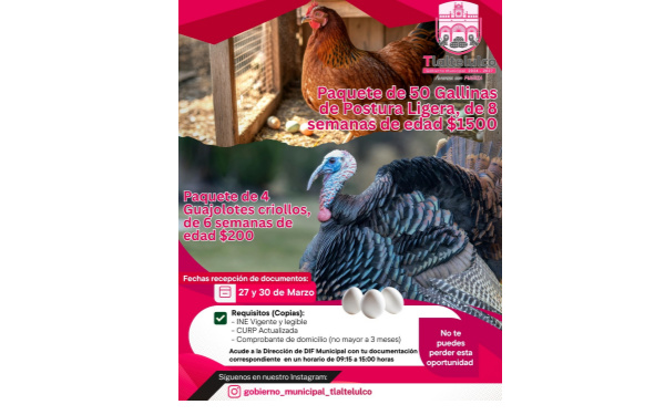 De acuerdo con la convocatoria, se ofrecen paquetes de 50 gallinas de postura ligera de ocho semanas de edad a un costo de mil 500 pesos, así como paquetes de cuatro guajolotes criollos de seis semanas en 200 pesos, lo que representa una opción accesible para quienes buscan iniciar o fortalecer la crianza doméstica.