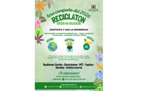 385Grados / Tetlanohcan / REDACCIÓN / Con el objetivo de fomentar la cultura del reciclaje y el cuidado del entorno, el Gobierno Municipal de Tetlanohcan, encabezado por la presidenta municipal Kritsbey Pérez Flores, invita a la ciudadanía a participar en la 1era campaña del Reciclatón 2026, que se llevará a cabo el próximo lunes 13 de abril.