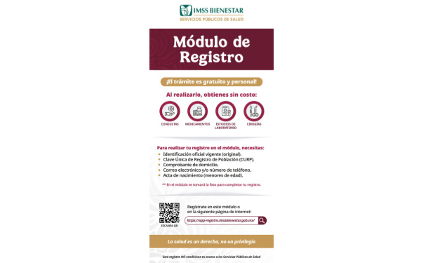 Asimismo, se instalará un módulo de registro de IMSS Bienestar, mediante el cual las y los ciudadanos podrán incorporarse a este sistema y acceder a servicios como consultas médicas, medicamentos y estudios de laboratorio.