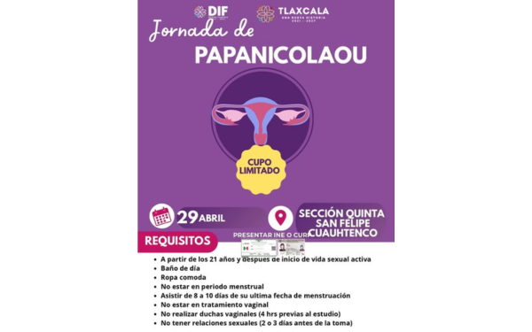385Grados / Contla de Juan Cuamatzi / REDACCIÓN / El Gobierno Municipal de Contla de Juan Cuamatzi, a través del Sistema Municipal DIF y en coordinación con el SEDIF Tlaxcala, anunció la realización de una jornada gratuita de Papanicolaou, con el objetivo de fomentar la detección oportuna y el cuidado de la salud de las mujeres.