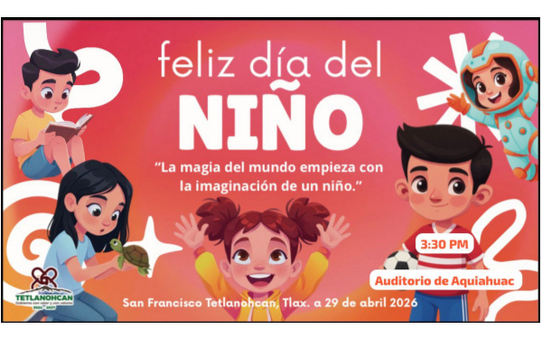 385Grados / Tetlanohcan / REDACCIÓN / Con motivo del Día del Niño y la Niña, el Gobierno Municipal de Tetlanohcan invita a las niñas y los niños del municipio a disfrutar de una tarde llena de alegría, sorpresas y diversión, este miércoles 29 de abril en el auditorio de Aquiahuac.
