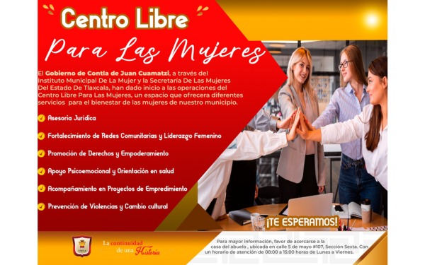 385 Grados / Contla / REDACCIÓN / Con el objetivo de brindar atención integral a las mujeres del municipio, el Gobierno de Contla de Juan Cuamatzi, en coordinación con la Secretaría de las Mujeres del Estado de Tlaxcala, puso en marcha el “Centro Libre”, un nuevo espacio ubicado en la Casa del Abuelo.