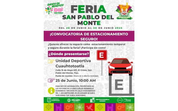 La convocatoria está abierta a quienes cuenten con un espacio disponible y deseen ponerlo al servicio de los visitantes como área de estacionamiento durante la feria. Las personas interesadas podrán acudir este 25 de junio a las 10:00 a.m. en la Unidad Deportiva Cuauhtotoatla, justo afuera de la alberca municipal, para recibir información y sumarse al proyecto.