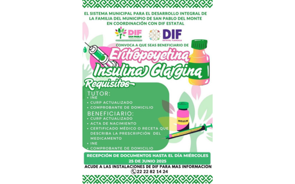 385Grados / San Pablo del Monte / REDACCIÓN / El Sistema DIF Municipal de San Pablo del Monte, en coordinación con el DIF Estatal, invita a la ciudadanía a acceder a un importante apoyo en materia de salud mediante la entrega de Eritropoyetina e Insulina Glargina, medicamentos esenciales para personas con enfermedades crónicas.