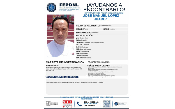 La Fiscalía General de Justicia del Estado, a través de la Fiscalía Especializada en Personas Desaparecidas y No Localizadas ha abierto una carpeta de investigación con el número AI FEPDNL/100/2025 para esclarecer las circunstancias de este hecho.