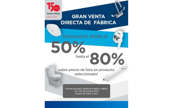 385Grados / Tlaltelulco / REDACCIÓN / Con motivo de su 150 aniversario, la marca American Standard y el ayuntamiento de La Magdalena Tlaltelulco anunciaron su Gran Venta Directa de Fábrica, en la que los clientes podrán adquirir productos seleccionados con descuentos que van del 50 al 80 por ciento sobre el precio de lista.