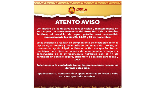385Grados / Contla / REDACCIÓN / El Gobierno Municipal de Contla de Juan Cuamatzi informó que, debido a los trabajos de rehabilitación y mantenimiento en los tanques de almacenamiento del Pozo número 1 de la Sección Séptima, el servicio de agua potable será suspendido temporalmente los días 24, 25, 26 y 27 de noviembre.