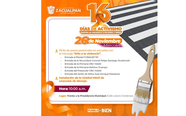 385Grados / Zacualpan / REDACCIÓN / Zacualpan / En el marco de la campaña internacional “16 Días de Activismo contra la Violencia a Mujeres y Niñas”, el Ayuntamiento de Zacualpan anunció diversas actividades a realizarse el miércoles 26 de noviembre, enfocadas en la concientización y prevención de la violencia de género.