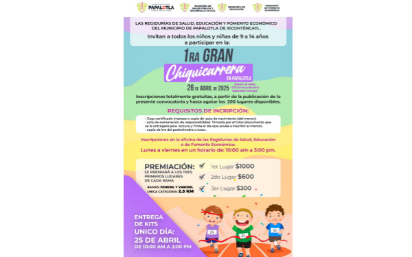 385 Grados / Papalotla / REDACCIÓN / La primera Gran Chiquicarrera de Papalotla, organizada con motivo del Día del Niño, sigue recibiendo inscripciones para su evento programado el próximo 26 de abril.