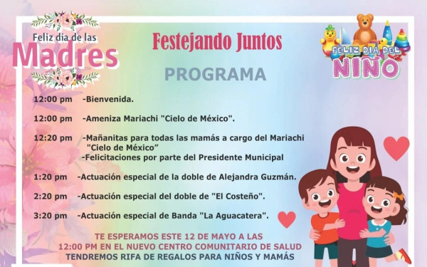 Niñas, Niños y Mamás acudan este domingo a partir de las 12: 00 habrá rifas tanto para los pequeños como sus madres y muchas sorpresas más.