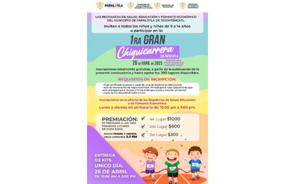 385 Grados / Papalotla / REDACCIÓN / Las Regidurías de Salud Pública, de Desarrollo Agropecuario, así como de Educación del municipio de Papalotla anunciaron la Primera Gran Chiquicarrera, un evento deportivo dirigido exclusivamente a niños y niñas de 9 a 14 años de edad.