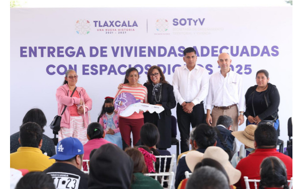 385 Grados / SOTyV / REDACCIÓN / Con una inversión superior a los 4 millones de pesos, la gobernadora Lorena Cuéllar Cisneros entregó de forma simbólica 47 acciones de vivienda, 40 cuartos-dormitorio y 7 cuartos-dormitorio con baño, realizados a través de la Secretaría de Ordenamiento Territorial y Vivienda (SOTyV), en Mazatecochco.