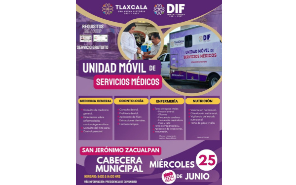 385Grados / Zacualpan / REDACCIÓN / El próximo miércoles 25 de junio, la Unidad Móvil de Servicios Médicos del DIF Estatal Tlaxcala visitará la cabecera municipal de San Jerónimo Zacualpan, con el objetivo de acercar atención médica gratuita a la población.