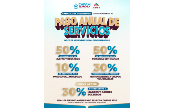 Asimismo, el Gobierno Municipal recordó que la campaña de descuentos por el pago anual del servicio de agua potable permanecerá vigente hasta el 31 de enero de 2026, como parte de una política orientada a fortalecer la cultura del pago responsable y brindar un respaldo directo a las finanzas de los hogares tlaxcaltecas.