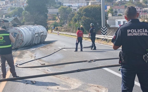 385 Grados / Tlaxcala/ REDACCIÓN / Elementos de la policía municipal de Tlaxcala implementaron labores de abanderamiento preventivo en la vía Apizaco–Tlaxcala, a la altura de San Esteban Tizatlán, con sentido hacia la capital y antes de llegar al puente peatonal, como parte del operativo de seguridad desplegado tras la volcadura de una pipa que transportaba gasolina, ocurrida la tarde de este martes.
