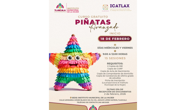 Asimismo, el Instituto Municipal de la Mujer ofrecerá un curso gratuito de elaboración de piñatas, dirigido a mujeres interesadas en aprender un oficio con alto potencial de autoempleo. Este curso se impartirá los miércoles y viernes, de 9:00 a 12:00 horas, tendrá una duración de 15 sesiones.