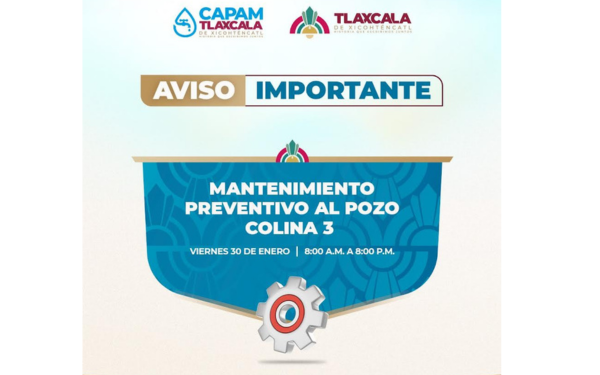 385 Grados / Tlaxcala / REDACCIÓN / El Ayuntamiento de Tlaxcala, a través de la Comisión de Agua Potable y Alcantarillado del Municipio (CAPAM), informa a la ciudadanía que el viernes 30 de enero se llevará a cabo un mantenimiento programado en el pozo Colina 3, con el objetivo de preservar el correcto funcionamiento de la infraestructura hidráulica y garantizar la continuidad y calidad del servicio de agua potable.