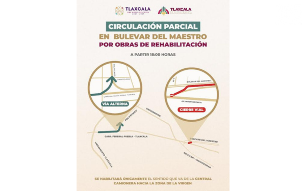385 Grados / Tlaxcala / REDACCIÓN / El Ayuntamiento de Tlaxcala informó que, como parte de los trabajos de rehabilitación del Bulevar del Maestro, a partir de este miércoles a las 18:00 horas se implementará una circulación parcial en esta vialidad, por lo que se habilitará únicamente el sentido que va de la Central Camionera hacia la zona de La Virgen.
