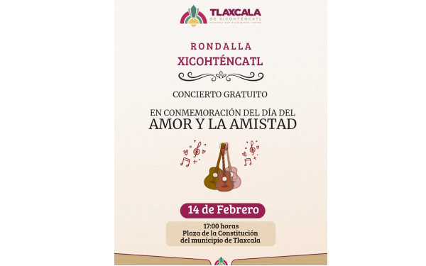 385 Grados / Tlaxcala Capital / REDACCIÓN ^ El Gobierno Municipal de Tlaxcala, que preside Alfonso Sánchez García, invita a la ciudadanía en general al concierto gratuito de la Rondalla Xicohténcatl, que se llevará a cabo el próximo sábado 14 de febrero a las 17:00 horas en la Plaza de la Constitución, como parte de las celebraciones por el Día del Amor y la Amistad.