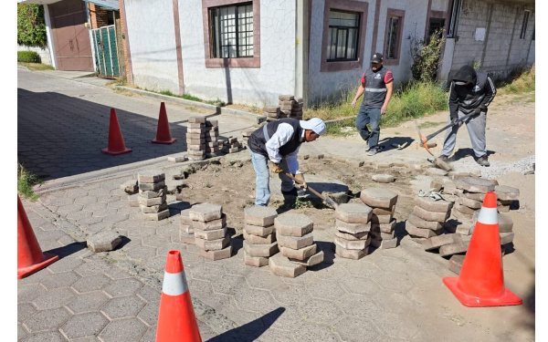 Además, se efectuaron labores de renivelación de adoquín en las calles Nogales y Membrillo, en la comunidad de La Trinidad Tepehitec, para mejorar la movilidad y seguridad vial.