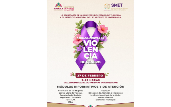 385 Grados / Tlaxcala Capital / REDACCIÓN / En una acción coordinada para garantizar el bienestar y los derechos de las mujeres tlaxcaltecas, el Ayuntamiento de la capital, que preside Alfonso Sánchez García, en coordinación con la Secretaría de las Mujeres del Estado de Tlaxcala, llevará a cabo la Brigada contra la Violencia de Género en la comunidad de San Lucas Cuauhtelulpan.
