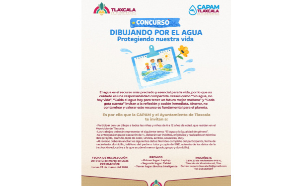 385 Grados / Tlaxcala / REDACCIÓN / Como parte de las acciones de atención a las causas y el fortalecimiento de los valores ciudadanos, el Ayuntamiento de Tlaxcala, encabezado por Alfonso Sánchez García, a través de la Comisión de Agua Potable y Alcantarillado del Municipio (CAPAM), convoca al concurso infantil “Dibujando por el Agua — Protegiendo nuestra vida”.