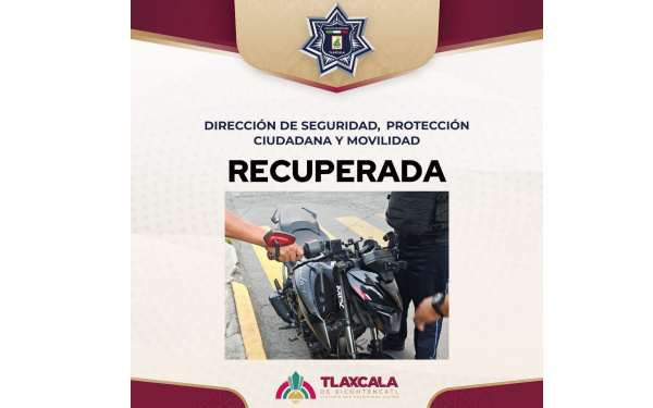 385 Grados / Tlaxcala Capital / REDACCIÓN / Elementos de la Dirección de Seguridad, Protección Ciudadana y Movilidad del municipio de Tlaxcala lograron la recuperación de una motocicleta con reporte de robo, tras atender un llamado ciudadano en Tlapancalco.