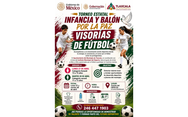 385Grados / Tlaxcala / REDACCIÓN / El Ayuntamiento de Tlaxcala, que preside Alfonso Sánchez García, a través de la Coordinación del Deporte, invita a niñas, niños y jóvenes a participar en el Torneo Estatal “Infancia y Balón por la Paz”, una iniciativa que promueve la sana convivencia, el desarrollo integral y la práctica deportiva como herramienta de transformación social.