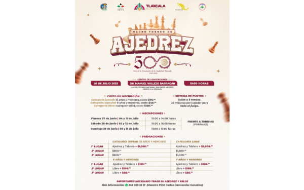 385 Grados / Tlaxcala / REDACCIÓN / Con motivo de los festejos por los 500 años de la fundación de la ciudad de Tlaxcala, el Ayuntamiento que preside Alfonso Sánchez García, invita al público en general a participar en el Magno Torneo de Ajedrez organizado por la Escuela Garméndez, un evento que reunirá a entusiastas de este milenario juego de estrategia de todas las edades.
