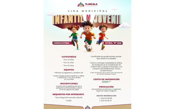 385 Grados / Tlaxcala / REDACCIÓN / Para promover la sana competitividad, convivencia y el gusto por la actividad física, el presidente municipal de Tlaxcala, Alfonso Sánchez García, a través de la Coordinación de Cultura Física y Deporte abrió la convocatoria para iniciar la Liga Infantil y Juvenil de Futbol 6, un nuevo espacio deportivo dirigido a niñas, niños y adolescentes del municipio.