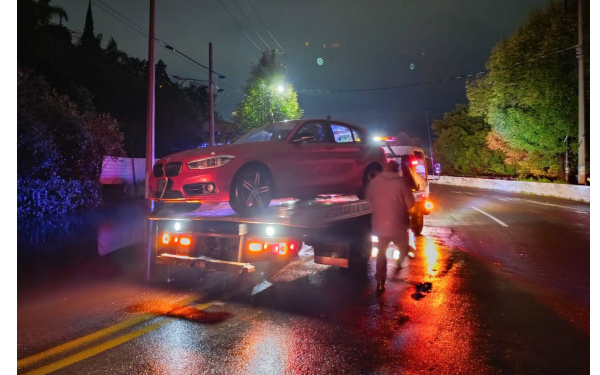 Se trató de un automóvil BMW color naranja, con placas XTC-180-A, que quedó varado debido a un encharcamiento en la cinta asfáltica. Al intentar brindar apoyo al propietario, este se mostró agresivo y se retiró del lugar, por lo que dejó la unidad cerrada y en condición de abandono.