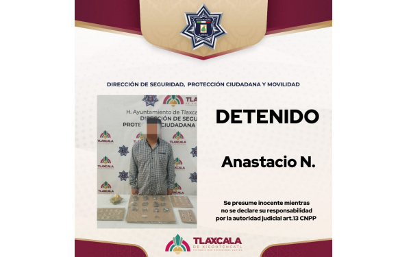 385 Grados / Tlaxcala / REDACCIÓN / A través de un operativo de prevención, elementos de la policía municipal de Tlaxcala lograron la detención de un hombre identificado como Anastacio “N”, de 39 años de edad y originario de Tlaxcala, quien fue sorprendido en posesión de diversas sustancias prohibidas en el Bulevar Guillermo Valle de la capital.