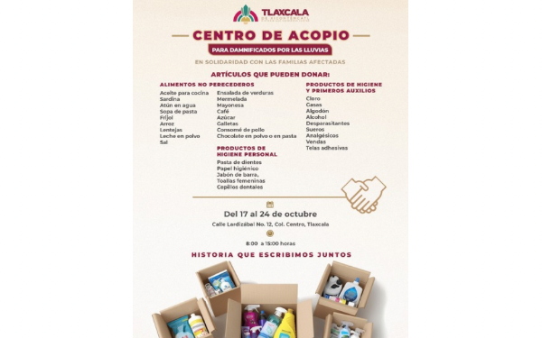 A través de la Coordinación Municipal de Protección Civil, el Ayuntamiento invita a la ciudadanía tlaxcalteca a sumarse a esta causa que refleja el espíritu de empatía y unión que caracteriza a la capital, con donaciones que se recibirán en calle Lardizábal No. 12, colonia Centro, Tlaxcala. Este centro de acopio permanecerá abierto desde este viernes y hasta el 24 de octubre, en un horario de 8:00 de la mañana a 3:00 de la tarde.