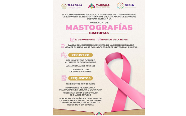 La jornada está dirigida a mujeres que no se hayan realizado una mastografía en el último año. El registro estará abierto hasta el 6 de noviembre y será vía telefónica al número 246 466 6456, en horario de 08:00 a 17:00 horas, de lunes a viernes.