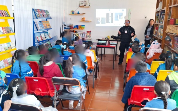 385 Grados / Tlaxcala / REDACCIÓN / Como una forma de promover entornos escolares más seguros y fomentar la cultura de la paz desde la niñez, elementos de la Dirección de Seguridad, Protección Ciudadana y Movilidad del Ayuntamiento de Tlaxcala impartieron una plática preventiva dirigida a alumnas y alumnos de la Escuela Primaria “Héroes de Chapultepec”, en la comunidad de Ocotlán.