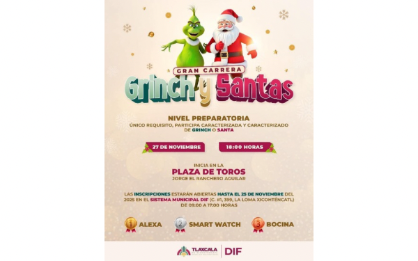 385 Grados / Tlaxcala / REDACCIÓN / En el marco de los festejos navideños de este año, el Ayuntamiento de Tlaxcala, que preside Alfonso Sánchez García, a través del Sistema Municipal DIF, invita a la ciudadanía a la carrera “Grinch y Santas”, que se llevará a cabo este jueves 27 de noviembre a las 18:00 horas, el cual tendrá como punto de partida la Plaza de Toros Jorge Aguilar “El Ranchero” y culminará frente a la sede del Palacio Municipal.