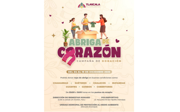 385 Grados / Tlaxcala / REDACCIÓN / El Ayuntamiento de Tlaxcala inició el pasado fin de semana la campaña de donación “Abriga de Corazón”, una iniciativa solidaria que busca reunir ropa de abrigo en buenas condiciones para apoyar a personas en situación vulnerable durante esta temporada invernal.