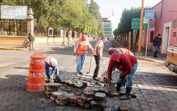 Como parte de los trabajos de mantenimiento permanente, brigadas municipales realizaron la renivelación de hundimientos en puntos del centro histórico, entre ellos la Calle Zitlalpopócatl y la Avenida Juárez.
