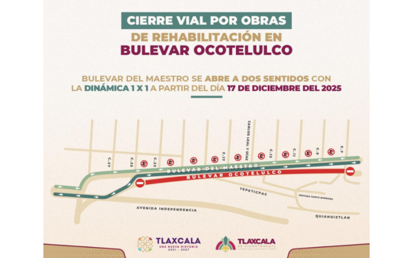 La primera etapa contempla el cierre total del Bulevar Ocotelulco, debido al deterioro estructural que presenta. Ante ello, el Bulevar del Maestro operará en doble sentido de forma temporal, con el objetivo de agilizar la circulación y reducir afectaciones a vecinos, comercios y conductores.